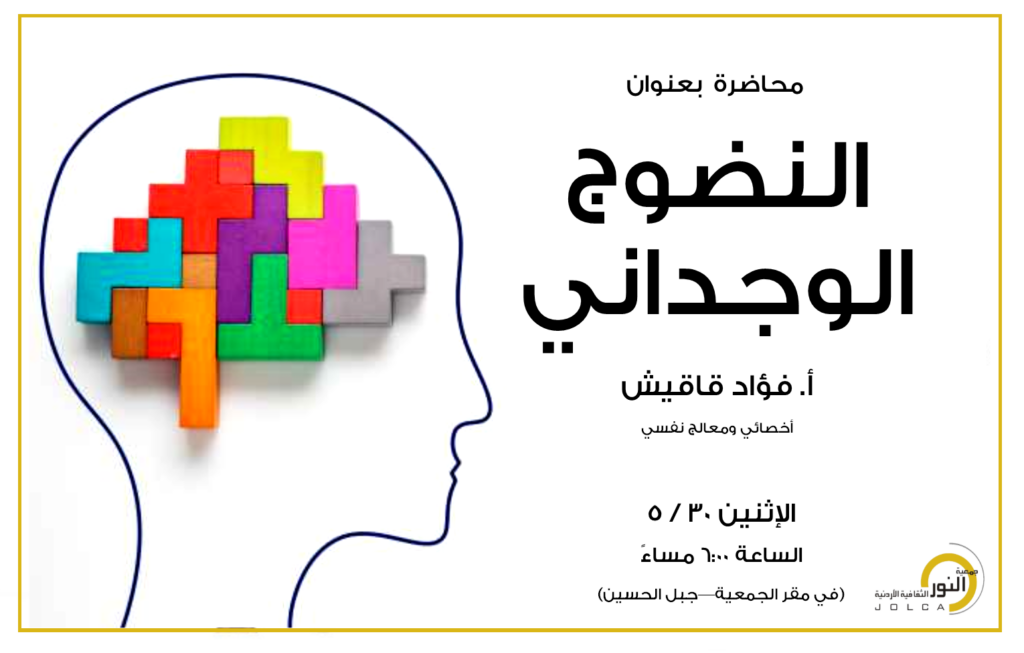 قدمت جمعية النور الثقافية محاضرة بعنوان ( النضوج الوجداني)وذلك يوم الإثنين 30/5/2022 في مقر الجمعية الكائن في جبل الحسين