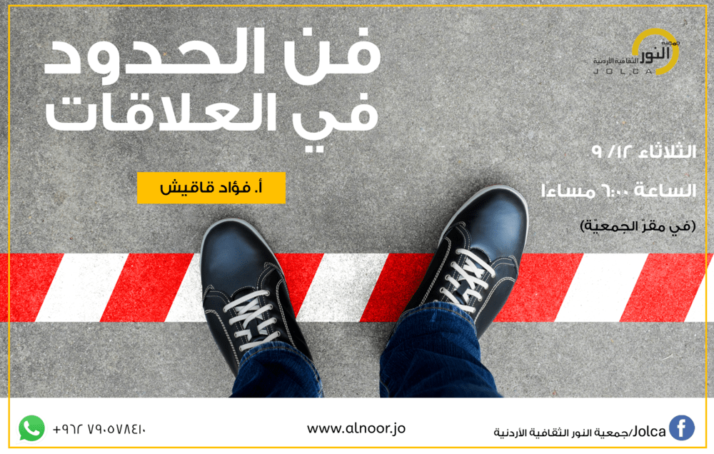 قامت جمعية النور الثقافية الأردنية بتقديم محاضرة بعنوان (فن الحدود في العلاقات) قدمها أ. فؤاد قاقيش يوم الثلاثاء 12-9-2023 في…